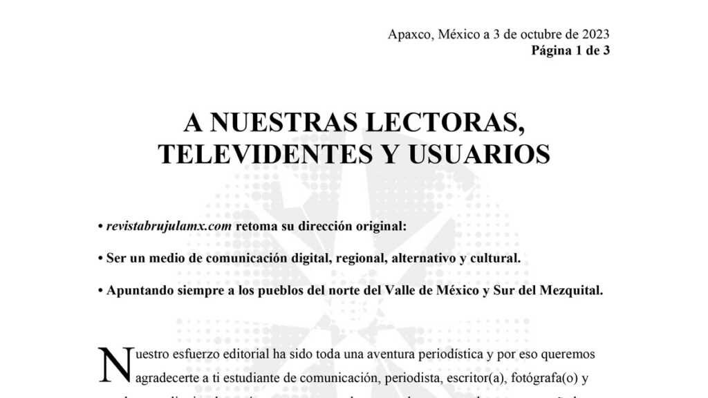 revistabrujulamx.com retoma su dirección original: Ser un medio de comunicación digital, regional, alternativo y cultural. Apuntando siempre a los pueblos del norte del Valle...
